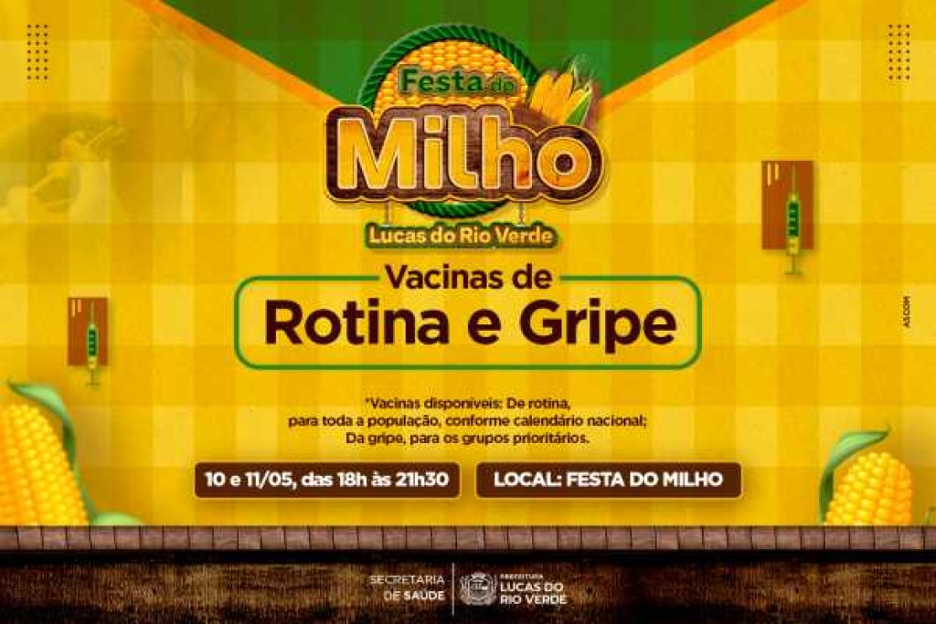 Serão ofertadas as doses contra a gripe e Covid-19, disponível para os grupos prioritários e todas as vacinas do calendário nacional. A Festa do Milho será realizada na rotatória da Prefeitura de Lucas do Rio Verde.