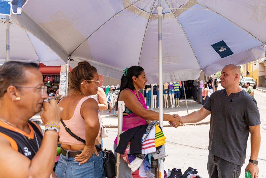 A foto mostra o prefeito de Cuiabá, Abilio Brunini, conversando com comerciantes ambulantes na Feira do Centro.