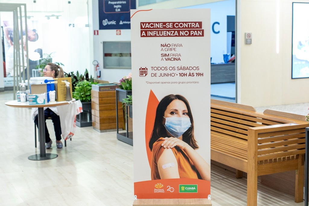 A imagem mostra o cartaz de propaganda da ação de vacinação que acontece nos principais shopping centers de Cuiabá. Ao fundo, há um banco de madeira no lado direito e, à esquerda, uma profissional está sentada próxima a uma mesa com os materiais utilizados na campanha.