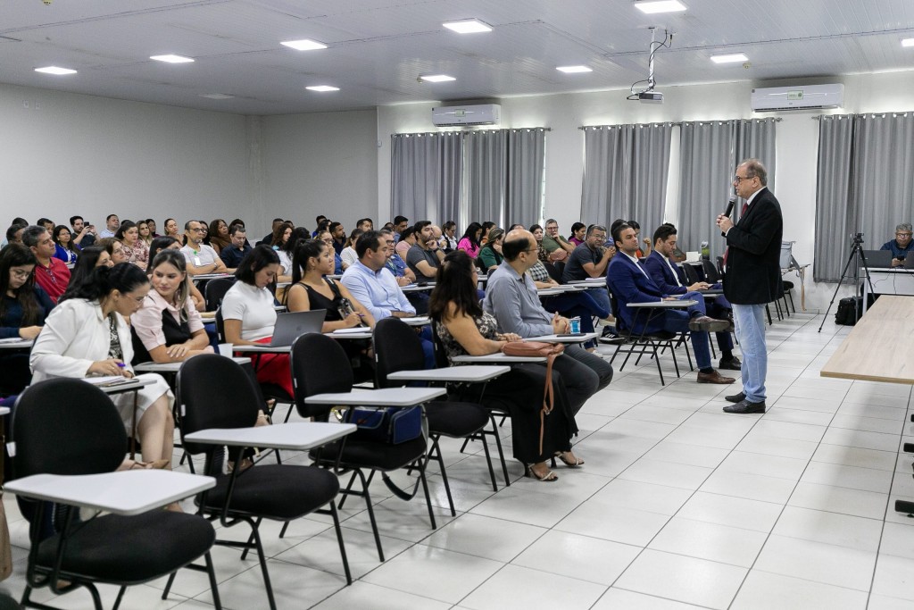 A foto mostra dezenas de servidores sentados em um auditório, ouvindo uma palestra.