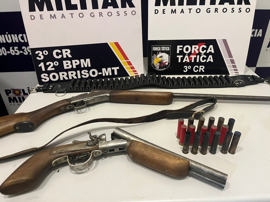 Na sequência, os policiais se deslocaram ao endereço informado pelo suspeito e localizaram o segundo homem, que não resistiu à abordagem. Ele levou os militares até onde estavam escondidas as armas, sendo uma espingarda de calibre 32 e uma garrucha, além de munições para o armamento.