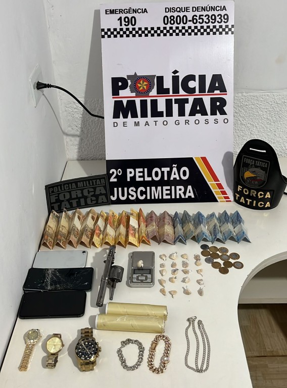 Equipes da Força Tática da 14ª Companhia Independente prenderam, nesta sexta-feira (13.09), um homem e duas mulheres por associação criminosa, porte ilegal de arma de fogo e tráfico de drogas, em Juscimeira (161 km de Cuiabá).