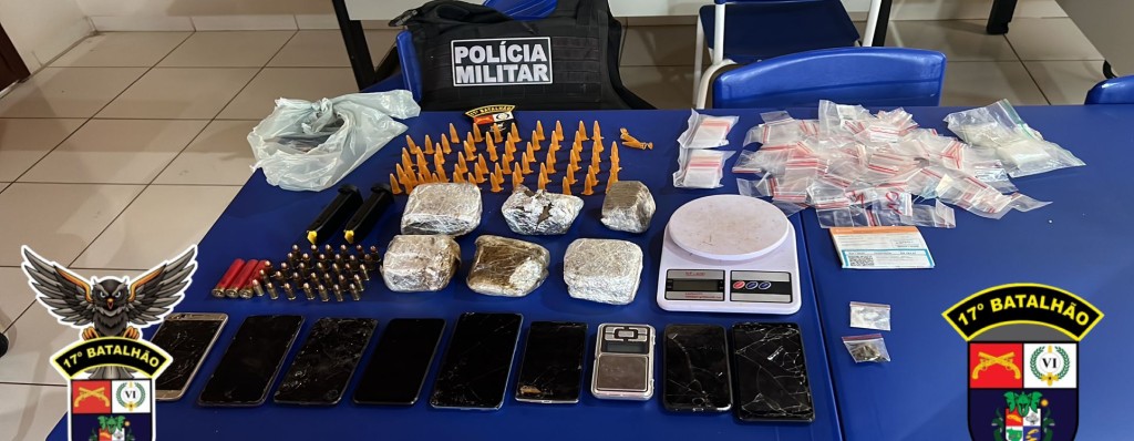 No local, as equipes apreenderam seis tabletes de maconha, 33 munições de calibre 9mm, dois carregadores de pistola, três cartuchos deflagrados de cal.28, oito aparelhos celulares e duas balanças de precisão.