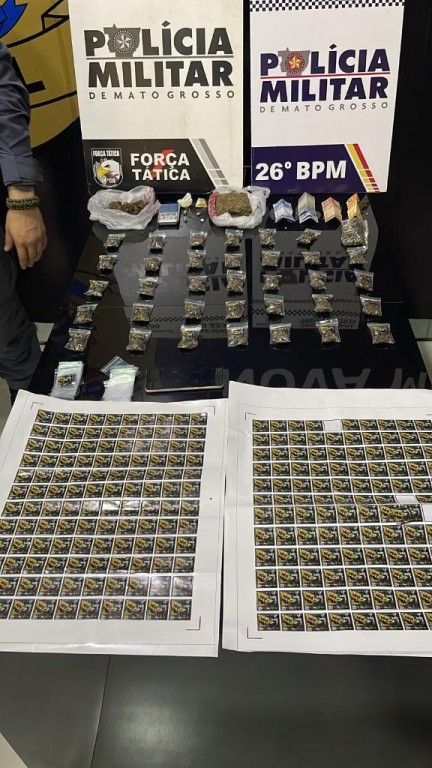 Em buscas pelo local, as equipes localizaram outras grandes porções de entorpecentes espalhadas pelo imóvel. Além disso, foram encontradas algumas impressões adesivas que estavam sendo coladas para etiquetar e separar as drogas, com um nome em apologia à facção criminosa.