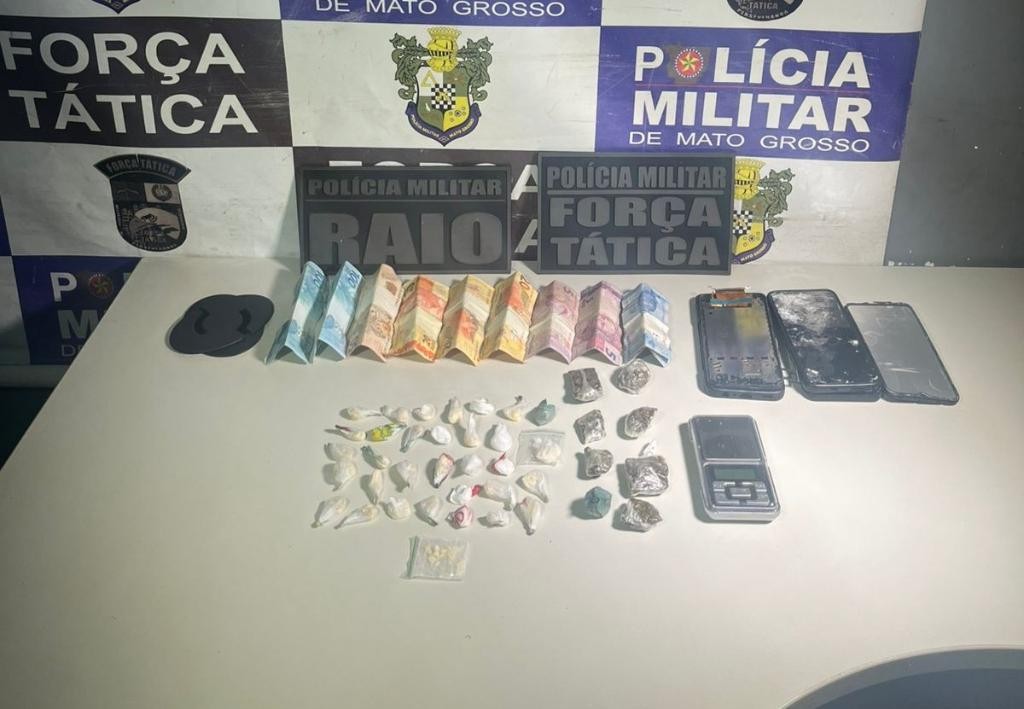 Equipes militares da Força Tática do 4º Comando Regional apreenderam, nesta quarta-feira (27.8), 41 porções de substâncias análogas à maconha, pasta base de cocaína e prenderam dois homens suspeitos por tráfico ilícito de drogas, em Rondonópolis (220 km de Cuiabá). Um dos detidos possui duas passagens criminais por homicídio.